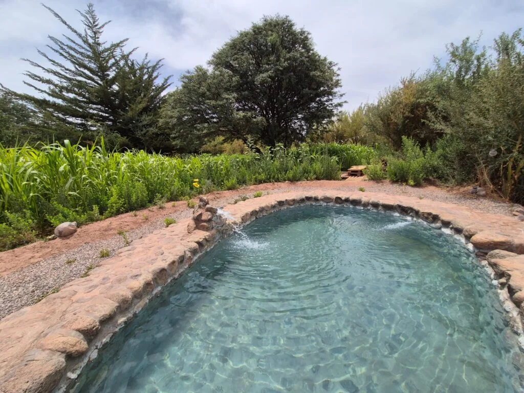 Las instalaciones incluyen pozas rústicas refrescantes construidas en piedra natural disponibles por turnos de 2 horas (Poza Baltinache para 10 personas y Poza Miscanti para 8 personas), zona de hamacas para descanso al aire libre, jardines con vegetación ornamental, estacionamiento dentro del recinto y espacios amplios que facilitan exploración familiar. El complejo mantiene ambiente tranquilo alejado del ruido urbano del centro de San Pedro.
